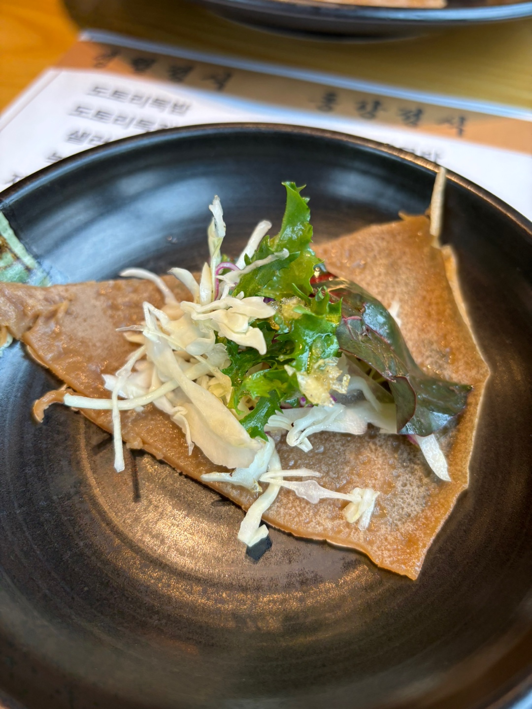 도토리 묵전만 먹으면 별 맛이 없는데 레몬소스가 뿌려진 샐러드랑 같이 먹으니